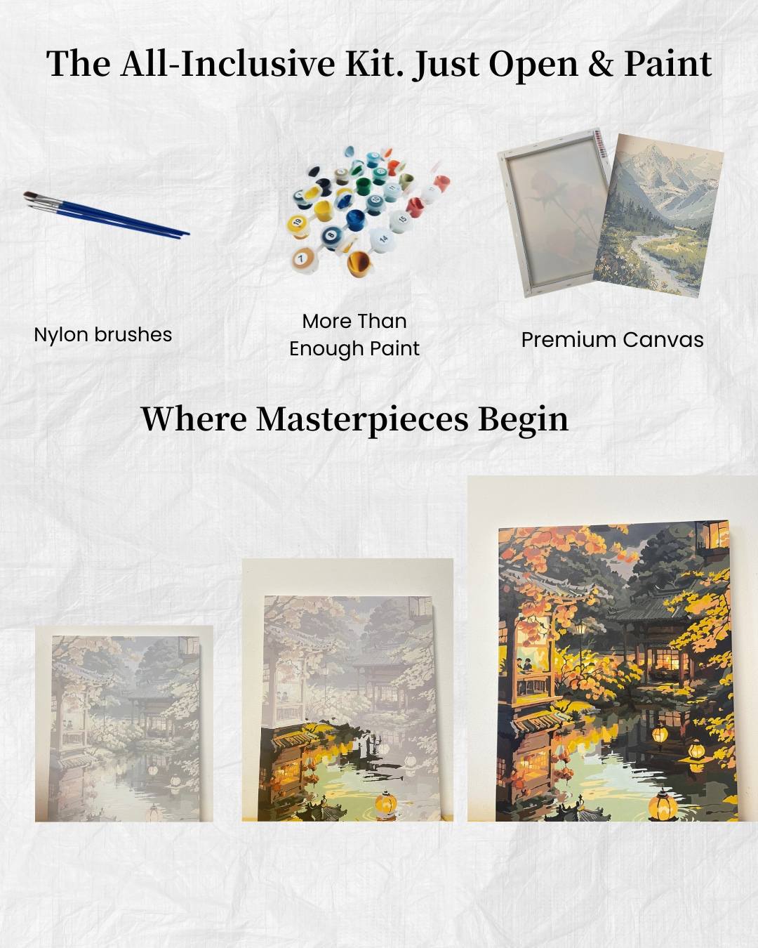 Your complete creative escape arrives ready to go. Includes a premium canvas, vibrant paints, brushes, and a guide—we've thought of it all.